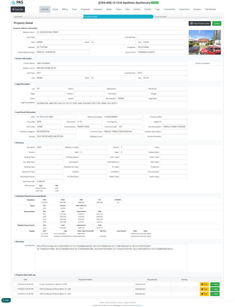 - The system fetches detailed property data and displays it in a structured format, as shown in the attached image. This includes information about the property’s location, owner, legal description, land parcel, structure details, valuations, taxes, assessments, deeds, and boundaries.